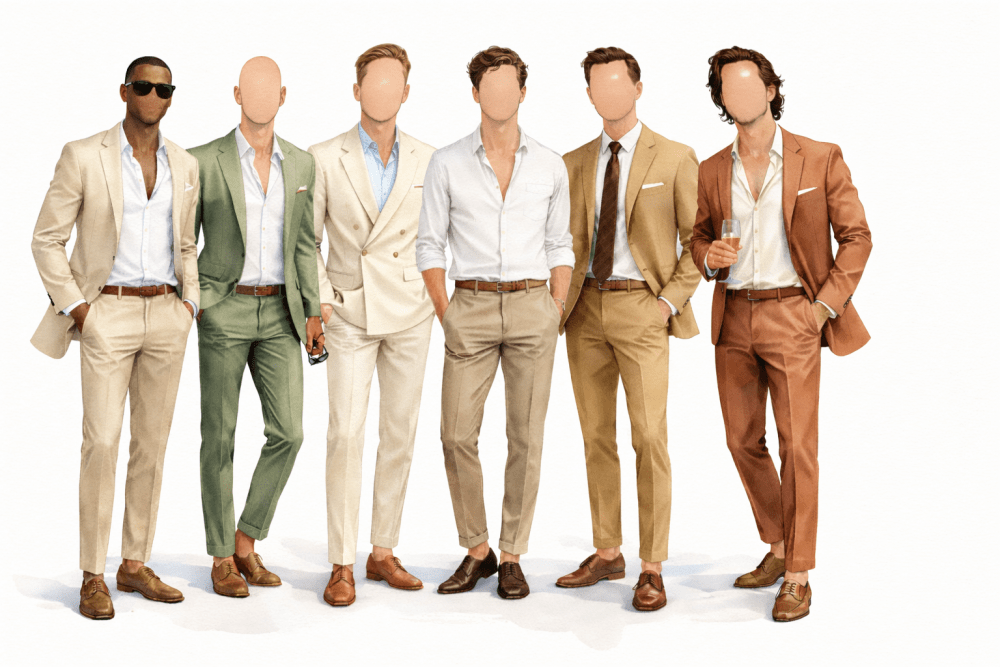Aposte em ternos claros ou combinações de camisa social e calça, em tons naturais como bege, verde, caramelo e off-white. Se puder, evite terno azul.